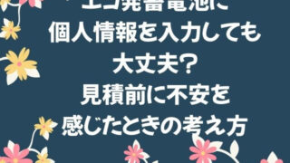 エコ発蓄電池について エコ発蓄電池に個人情報を入力しても大丈夫?見積前に不安を感じたときの考え方 エコ発蓄電池の見積で個人情報を入力しても大丈夫か不安な方へ。必要な情報の範囲や、安心して利用するための考え方をわかりやすく整理します。 2026.01.07 エコ発蓄電池について